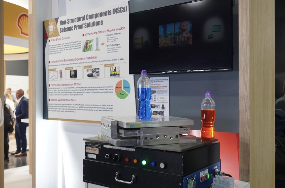 國研院本次展出的科技實體展品共有兩項,包含台灣國家地震工程研究中心研發的斜面滾動隔震支承(SRB)及水平振動台,SRB 所具備的抗震能力已實際應用在許多國家,並通過最近幾次地震的驗證,挽救了數十億的經濟損失。